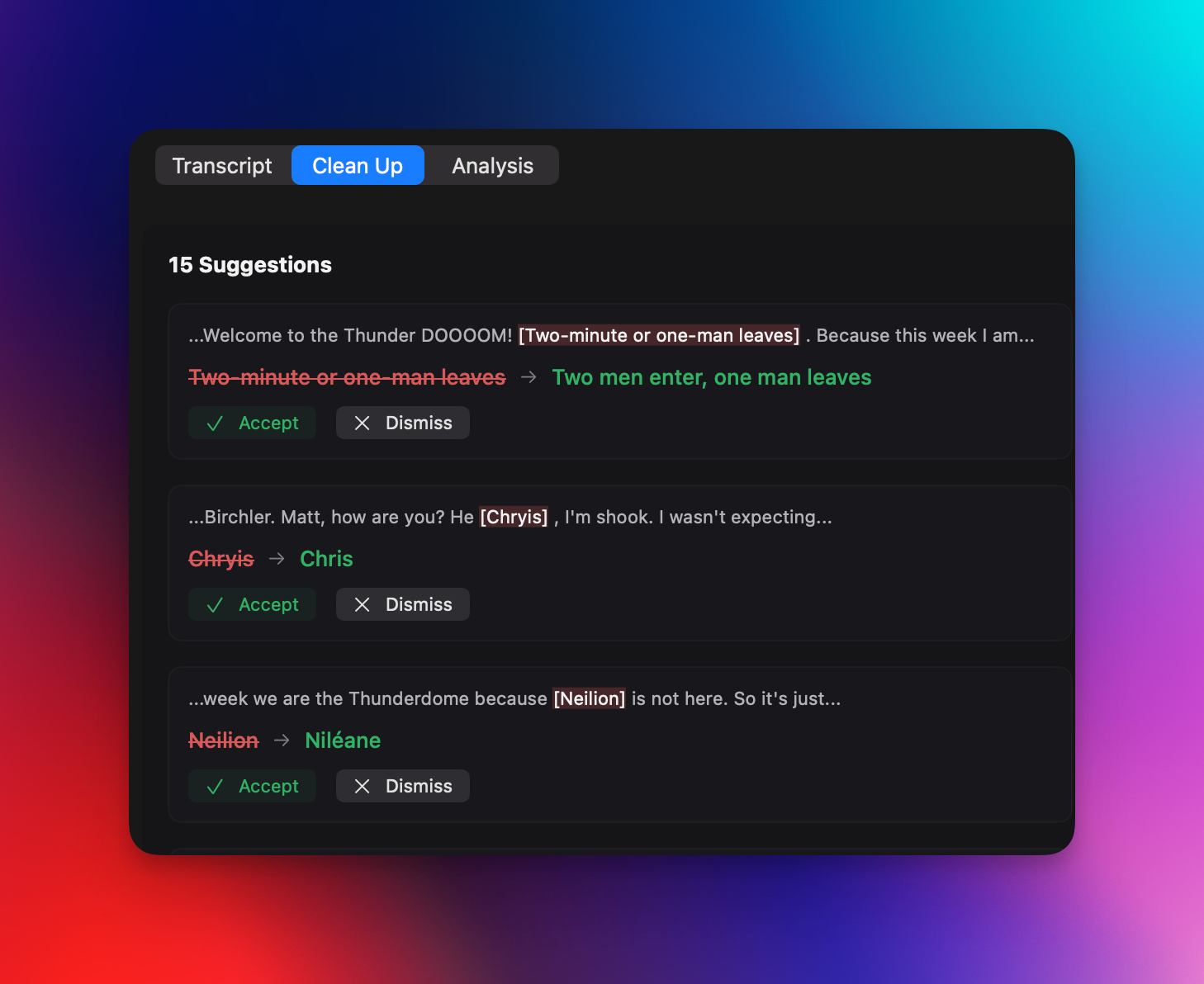 The second major update involves modifying the transcript, and this comes in two forms. After a transcript is created, the segments are now displayed in the UI rather than just raw text, and you can edit the transcript directly. So, if the transcription gets something slightly wrong, you can easily go in and fix it. For those using their own Gemini API key or a Quick Subtitles AI subscription, there's a new "clean up" feature. This analyzes the generated transcript, identifies potential errors, and gives you the option to correct them. This is presented in an intuitive UI that allows you to tell the LLM whether its suggestions are accurate or not. In my experience, it's correct over 90% of the time, and I usually approve all of its suggested changes. If you're confident in its accuracy, you can enable "YOLO mode" in the AI settings, which automatically applies all changes. While these transcription models are very impressive, and significantly better than previous options for generating subtitles, especially on-device, they aren't perfect. These new tools provide more freedom to address any issues that may arise.