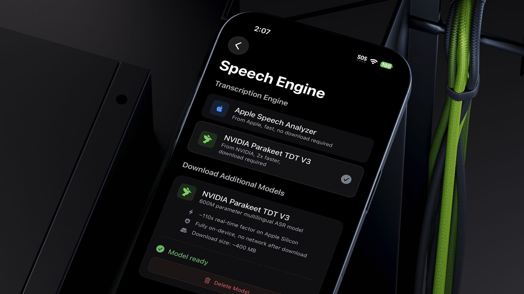 The third key feature is a new model selection option. Previously, Quick Subtitles exclusively used Apple's on-device speech-to-text analyzer, which was fast and of high quality. Now, you have another option: NVIDIA's Parakeet V3. This model performs the same function as Apple's, but in some cases, it's more accurate, and in many cases, it's up to twice as fast at generating the transcript. The results I've seen have been genuinely shocking, especially considering how impressed I was with Apple's model just eight months ago. You can enable this in the app settings under the new model selector. Note that you'll need to perform a several-hundred-megabyte download to install it on your device. As always, this model is 100% locally processed, so your audio files never leave your device or use a cloud service. On a side note, the performance and quality of this model have impressed me so much that I'm considering incorporating it into QuickNotes to enhance that app as well.