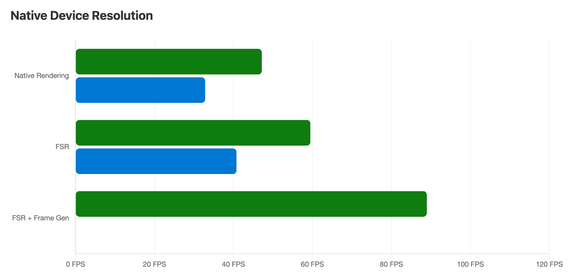 All settings were the same, and I was using the "handheld" graphics presets on both devices. For FSR, I used the "balanced" option. Xbox numbers in green, Steam Deck in blue.