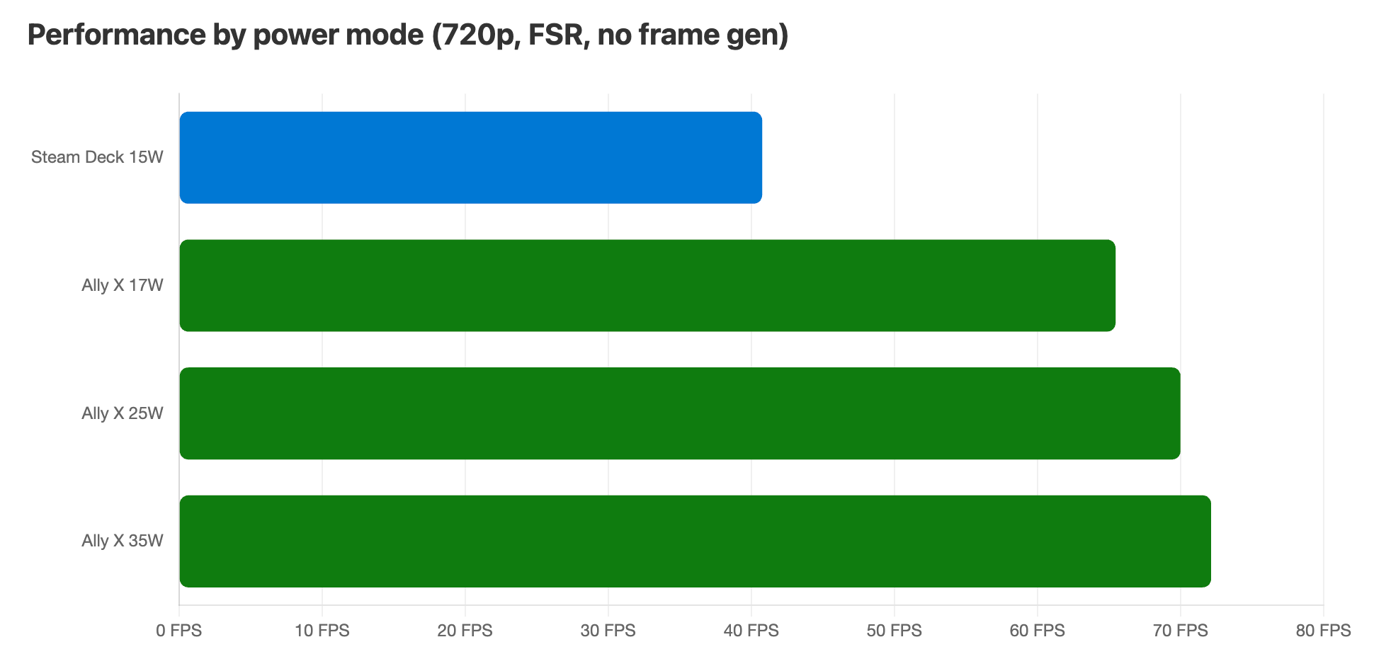 One of the reasons for this gap in performance is power. The Steam Deck can deliver 15 watts of power to the SoC, and that's pretty darn low energy, but it's the trade-off Valve has made so that they could make a relatively thin device that didn't get too hot and that didn't have 30-minute battery life. Meanwhile, the Ally X has several power modes you can choose between. There's a 13W silent mode, which is very low power, a 17W normal mode, and then 25W turbo mode that boosts up to 35W when plugged into a charger.