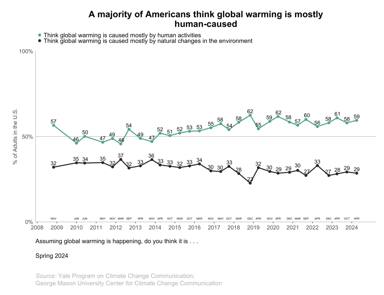 The numbers are pretty stark. Basically, if you answered no to this question, you're in the 13% of Americans who feel that way. If you said yes, you're in a massive majority. And even in the "we're losing the science debate so badly we need to pivot to yes it's happening but not because of us" argument, it's still a 2-to-1 ratio, which a gap that's slowly but surely widening.