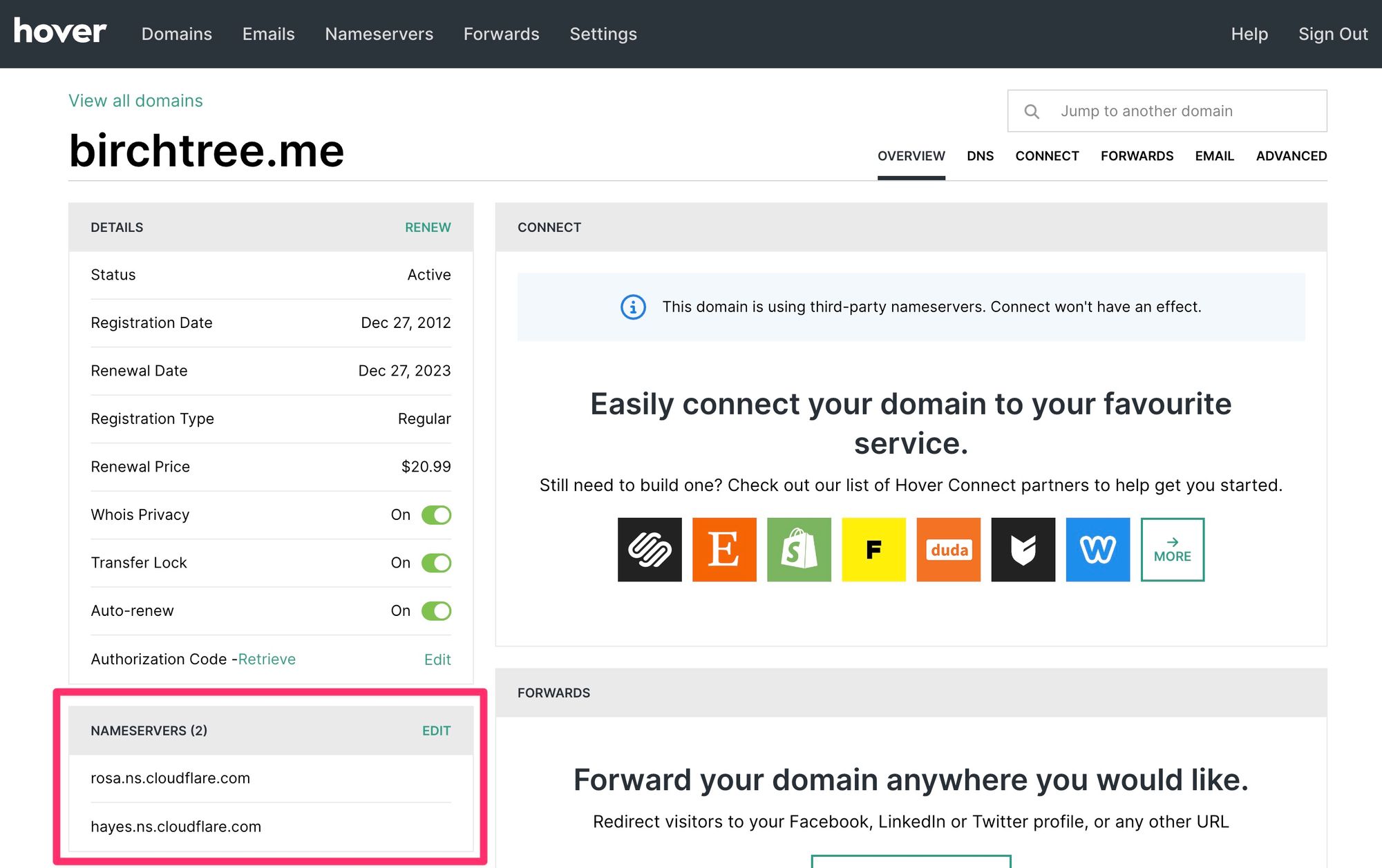 I own this domain through Hover and I'm using CloudFlare for DNS. On the Hover side, that means all I have to do is enter the nameservers CloudFlare told me to use (see below). This completely negates the need to do anything with DNS in Hover's interface, as CloudFlare is handling everything.