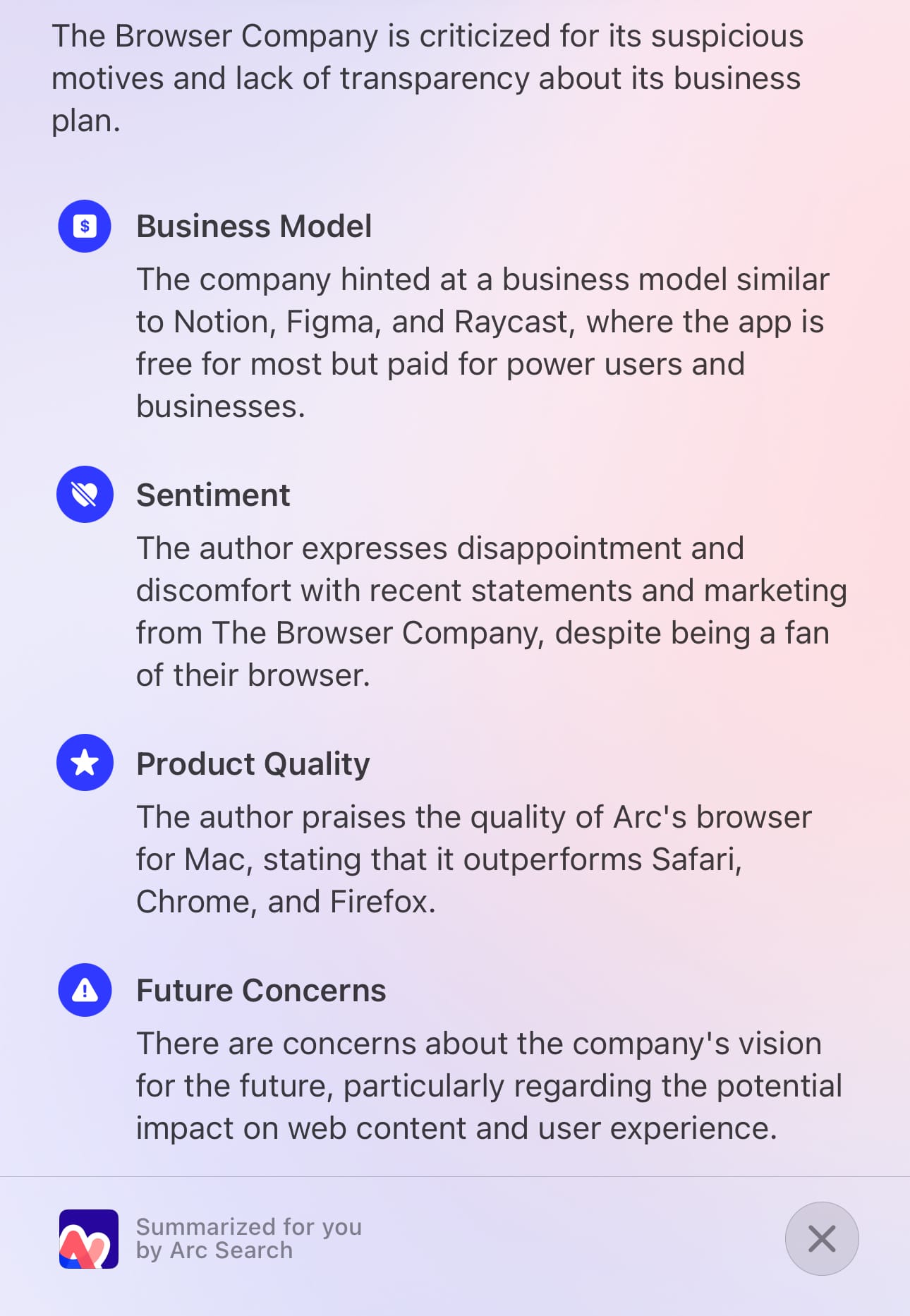 But if you listen to them lately, namely their CEO, you’ll get a message from them that’s more like, “you know what sucks? The web! What if we piggybacked on Google’s search results, which we also say suck but are essential for Arc Search to function, stole every bit of writing other people have made and regurgitate it to you as a few bullet points?” The Browser Company seems to consider the ultimate goal to be people use Arc to ask questions and never see an actual website, they just see Arc giving them all the answers. They show links in their “browse for me” summaries now, but I get the impression they would like to get rid of those if they can.
