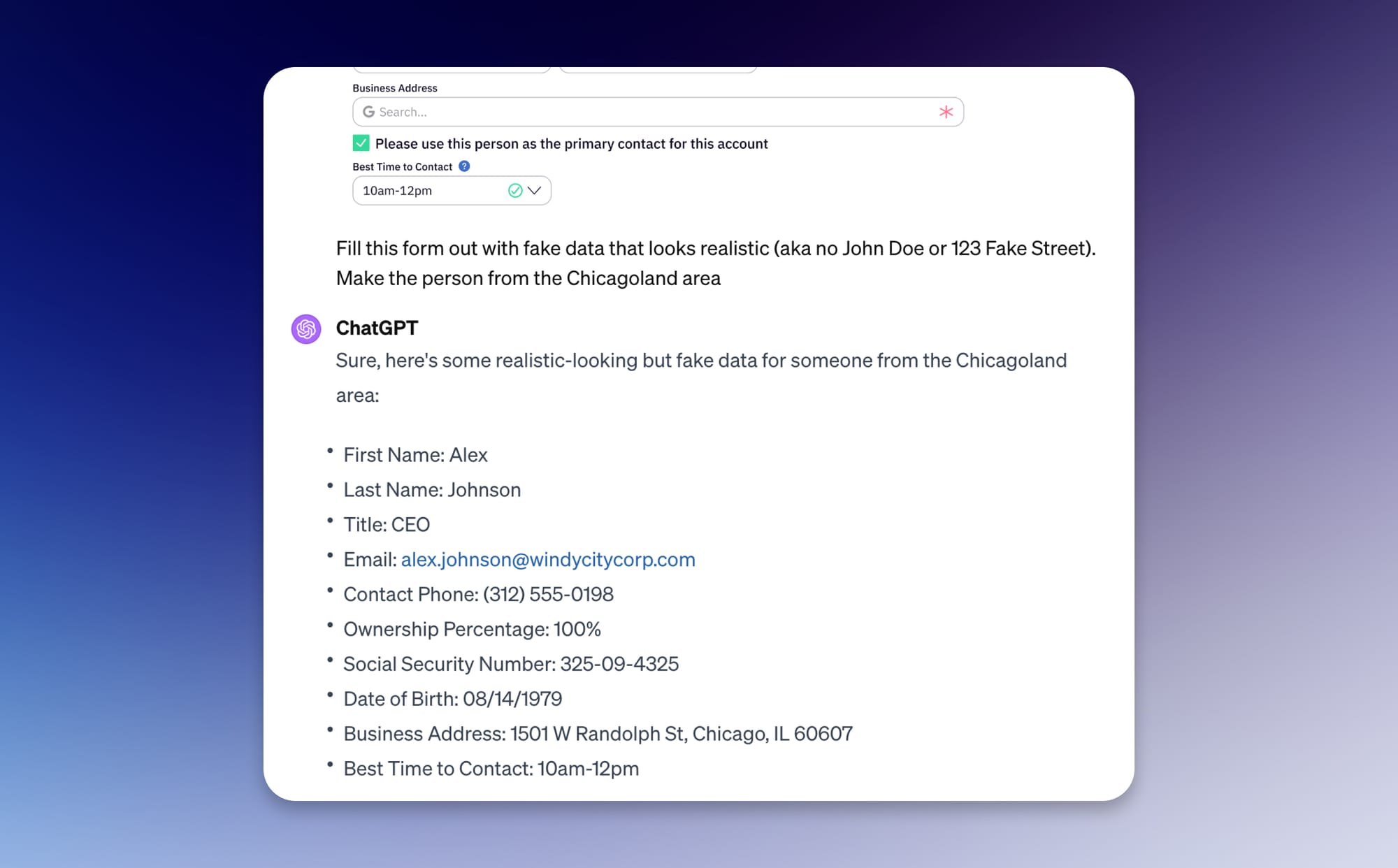And I can use ChatGPT's conversational nature to make the rest of the pages in this form get realistic fake data that's consistent with this first response. So if the next page asked for business info, it would remember that Alex Johnson is the CEO, it's a Solo Proprietorship in Chicago, and it would base the business info on that.