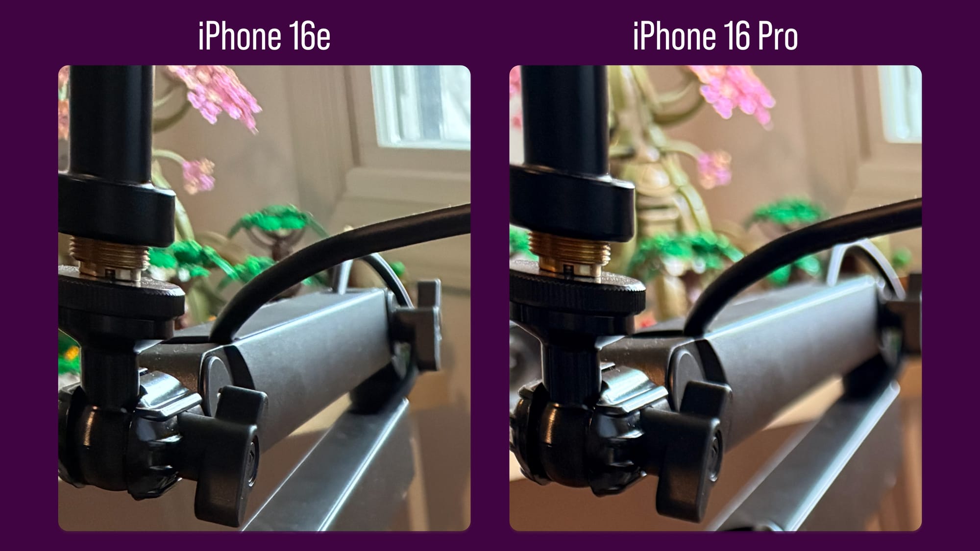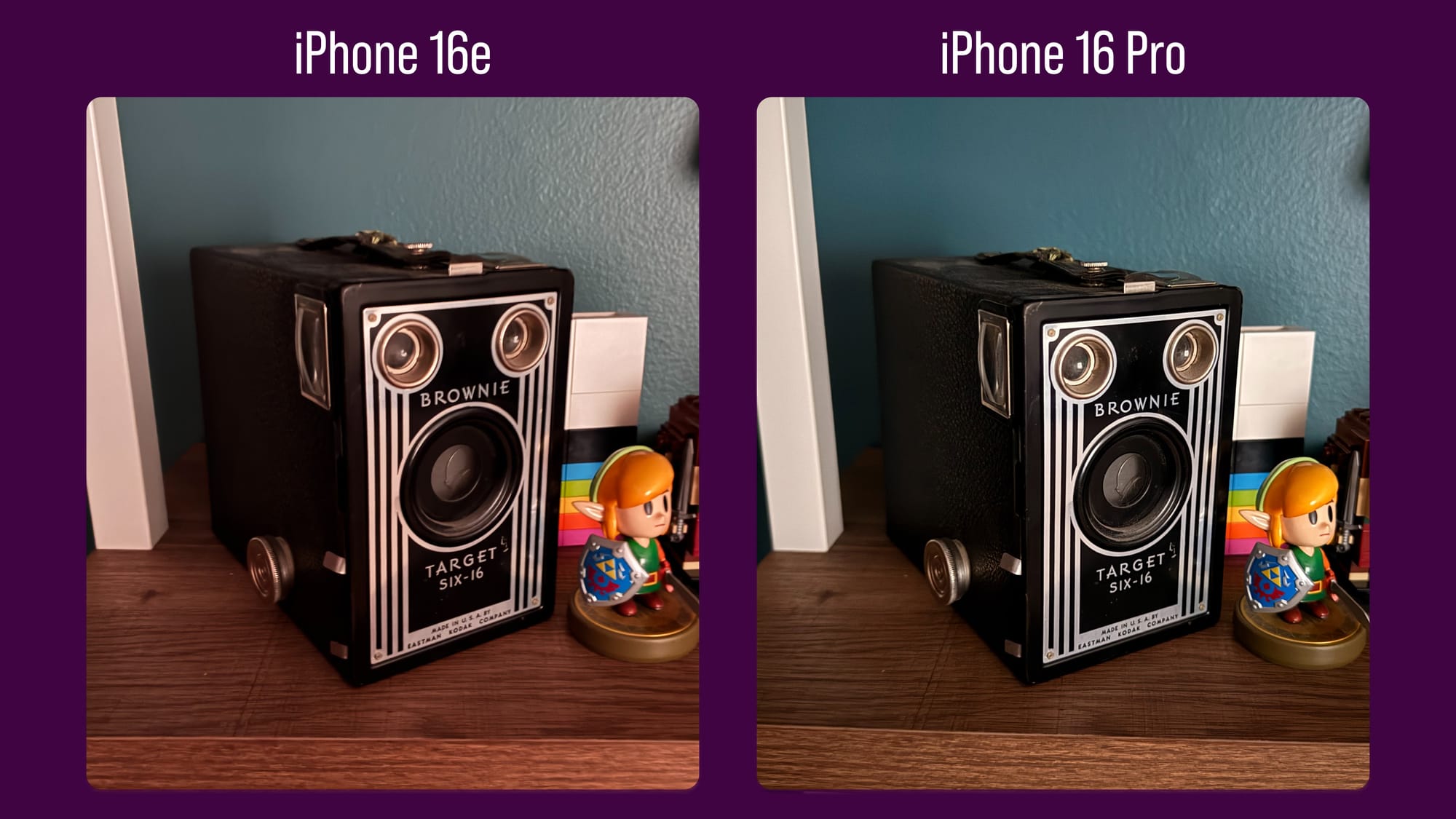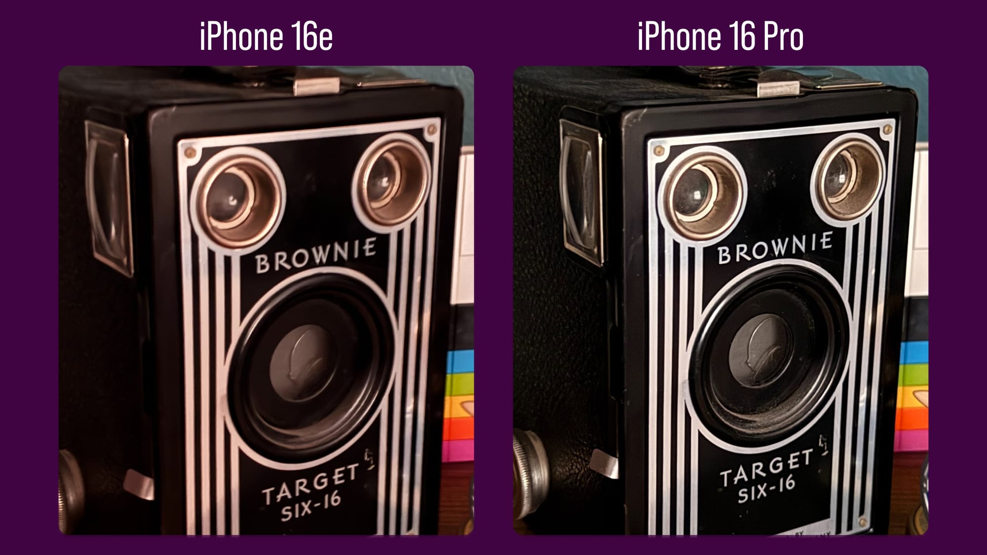 This is a photo taken in my office of a nearly 100-year-old camera. Again, color differences aside (I had the 16e set to warm up images too much when I took this one), the 16 Pro is simply a more crisp image by a pretty wide margin. You can really see the difference when we zoom in on the center of the frame.