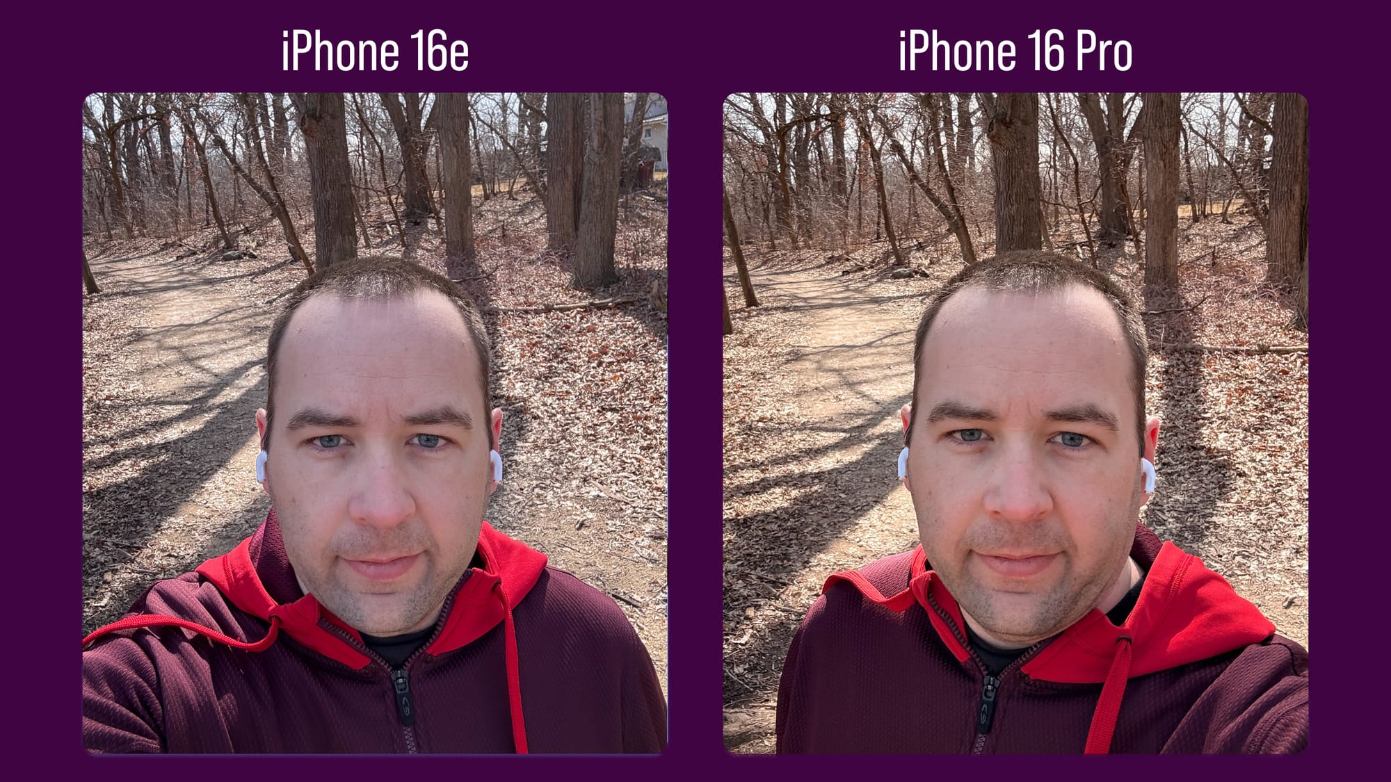 Once again, color differences aside, the selfies I’ve taken on both cameras look effectively identical, which makes since as I believe they share the same sensor and lens. Even zooming into uncomfortable levels shows no difference in clarity.