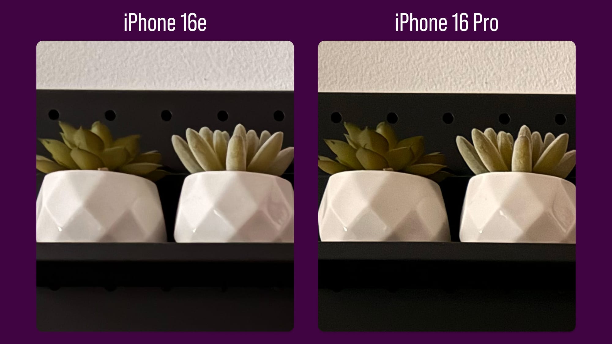 As another low light test, I took a picture of my wife’s pegboard in her office and here’s a detail comparison of a couple succulents.