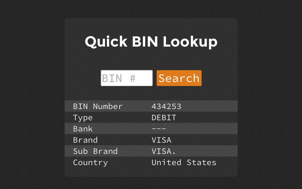 Back in 2016 I was working in a support role at a payments company and found myself regularly using a BIN lookup tool to get basic information about card issuers. Basic stuff like what country the issuing bank was from or if the card was credit or debit…nothing crazy, but these details can be helpful in troubleshooting issues.