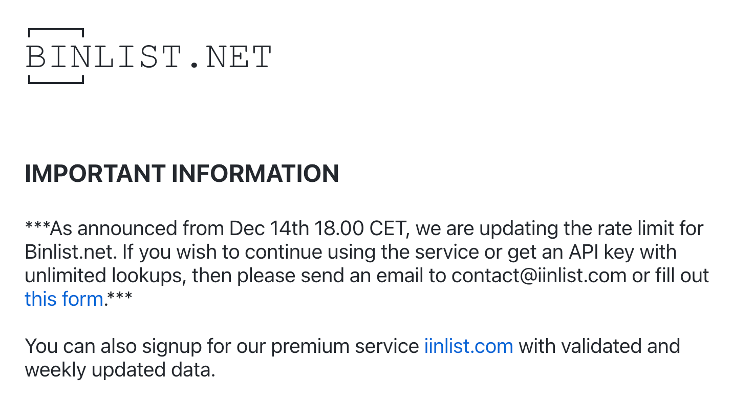 Also here at the end I'd like to clearly say I don't hold any ill will towards binlist for this change. I'm sad that it's likely going to kill my site, but I was using their API that they built and maintained to build a direct competitor to their site. If the site got 10 hits per day then who cares, but I can see why this use case at this scale is not something they would want to support anymore. We didn’t have any legal agreements, nor did we have any communication at all over these 8 years. I don’t search for BINs much anymore myself, but I do feel bummed for the many people who had come to rely on the site over the years.
