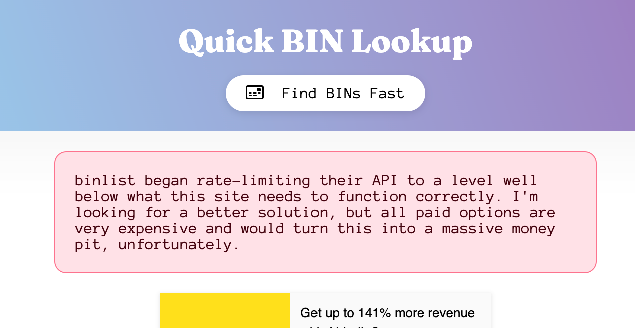 - Start paying for a premium BIN lookup API and start losing hundreds of dollars a month on the site
