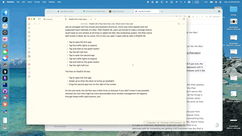 Take window management, for example. The iPad started by supporting one window at a time in full screen. 5 years into it's life, it got split screen, which was implemented in a limited, but very iPad-feeling way that embraced the touch UI and let you physically move apps next to each other to split the screen. macOS would get the same type of split screen shortly after, but that was all managed with the mouse and keyboard shortcuts, which was more aligned with the supported input methods of a Mac. With iPadOS 26, users are forced to make a strange choice: revert back to one window at all times or adopt the Mac-like windowing system, the iPad-native split screen is dead. By my count, this is how you open 2 apps side by side in iPadOS 26 using the standard UI: