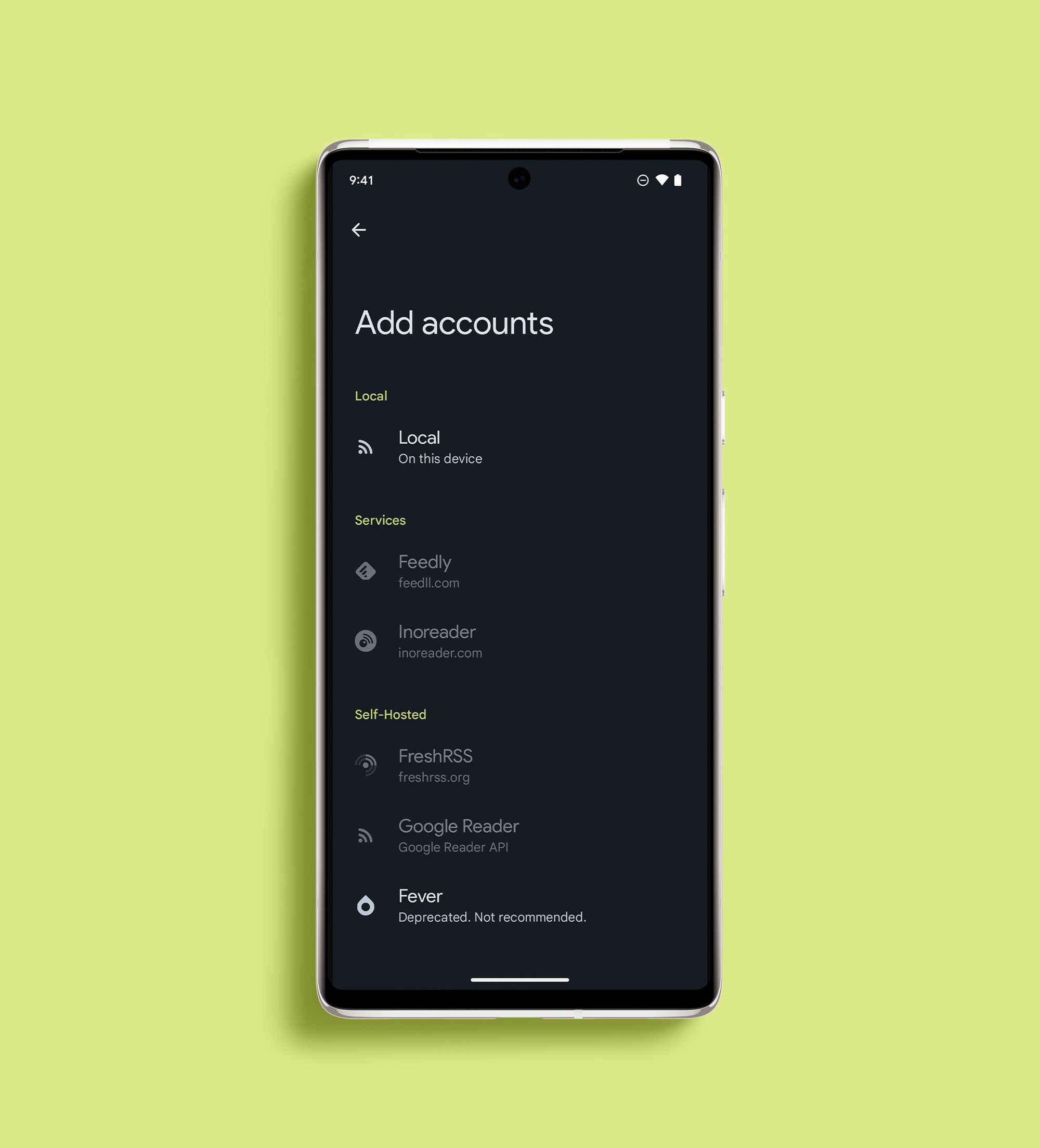 But this is an RSS reader, so I need to get some feeds in here. There's an Accounts page in Settings, but since this is in beta, it's not complete, and my only options are to do local feeds with no sync, or I can sign into my Fever account, a service that was discontinued 7 years ago. Hilariously, the app says this sync method is not recommended, but they built it anyway for some reason.