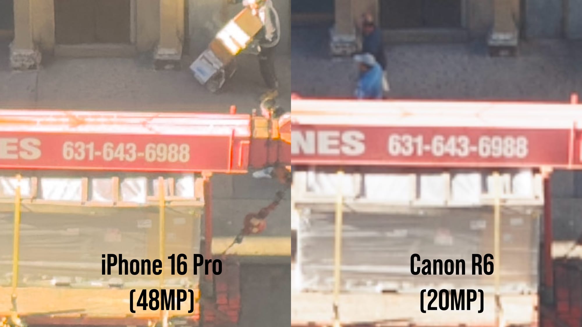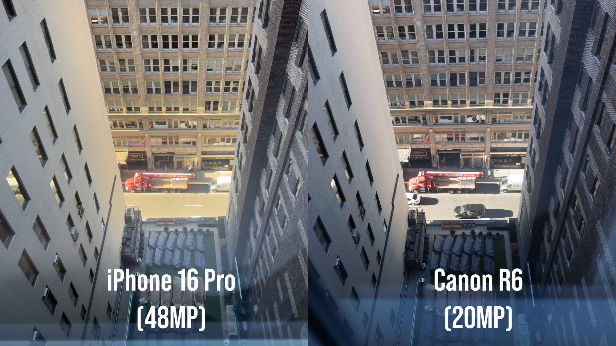 There was some really bad information out there recently about how the iPhone 16 Pro's sensor is really giving the clarity of a 6MP camera, and I did want to comment on that quickly as well. Here's a pair of photos taken out my hotel window in New York City. The left photo is from the iPhone 16 Pro at 48MP ProRaw and the right is from my Canon R6 at 20MP. Each camera was shooting at 24mm and no edits have been made to either photo.
