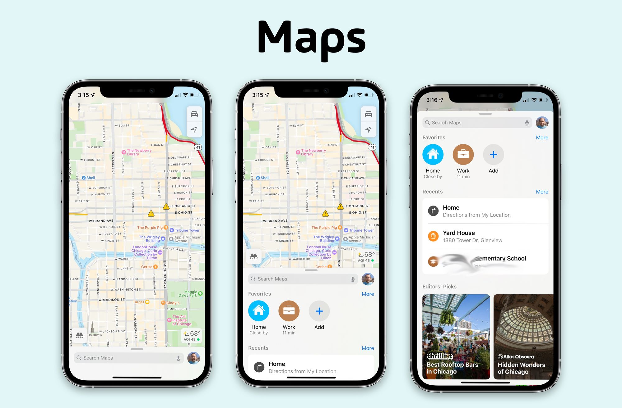 With the disclaimer up front that I did this in an hour and didn't do months of research that would have been expected for something like this, this was my attempt to basically paste the Safari features onto the Maps UI. Here's my layout vs the one that ships in iOS 15 beta 2: