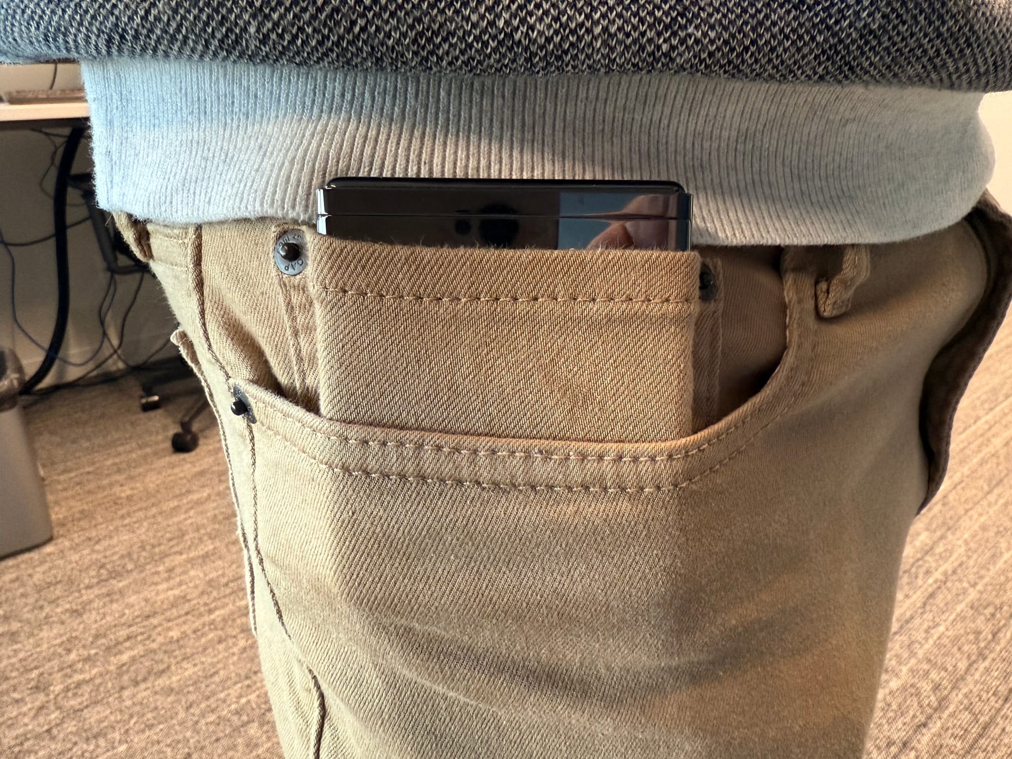 I've always loved the idea of a small phone, but the practicalities of small phones always falls flat for me. They have terrible battery life compared to normal phones and everything is cramped on the screen. These are simply facts, and while some people are happy to have those trade-offs, they're not things that work for me. That's what makes the flip style folding phones most compelling to me personally. This phone is basically as large as my iPhone 16 Pro Max, but it's absolutely tiny in my pocket. In fact, here it is (just barely) fitting in the coin pocket I use to carry my AirPods.