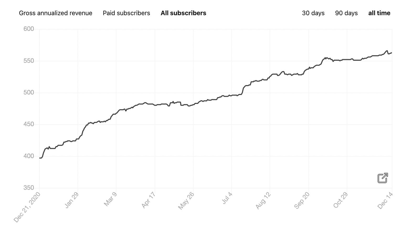 I moved to Substack from Mailchimp in December last year and brought my nearly-400 subs with me. Quick shout out to the value of owning my customer list. I'm going to close out the year with around 570 subscribers. It's about 43% growth, which is good, but it would be fair to say it's not setting the world on fire.