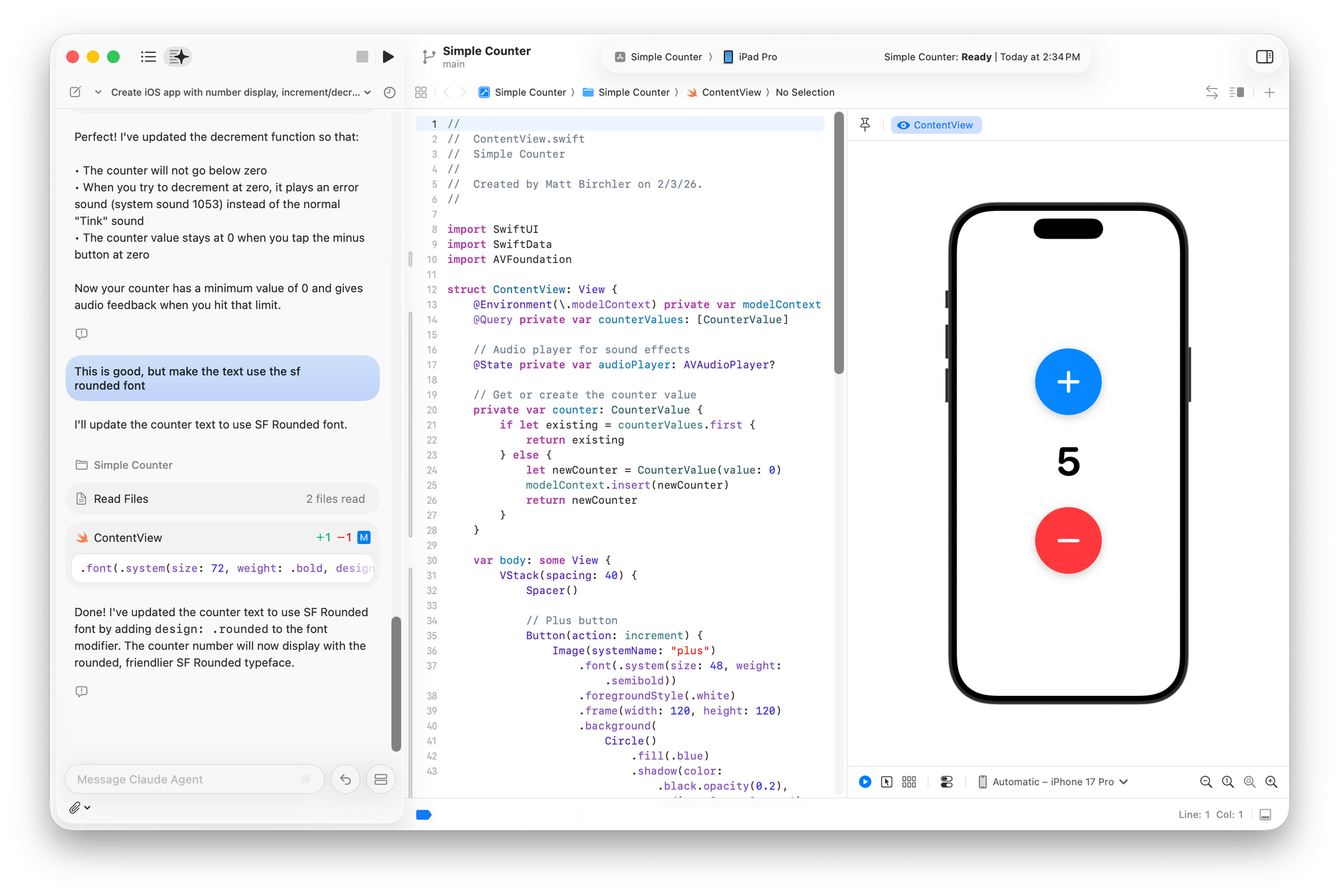 Apple released Xcode version 26.3 in beta today, and it introduces a new agentic coding feature. This is different from the coding assistant they've had since last fall, and my first impressions are that it is more capable. This is good, because what Xcode had before was far, far, far behind what the state of the art was in tools like Claude Code, Codex, or Cursor. Here's a very simple app I was able to throw together in no time using the new agent mode (complete with sound effects and haptics).