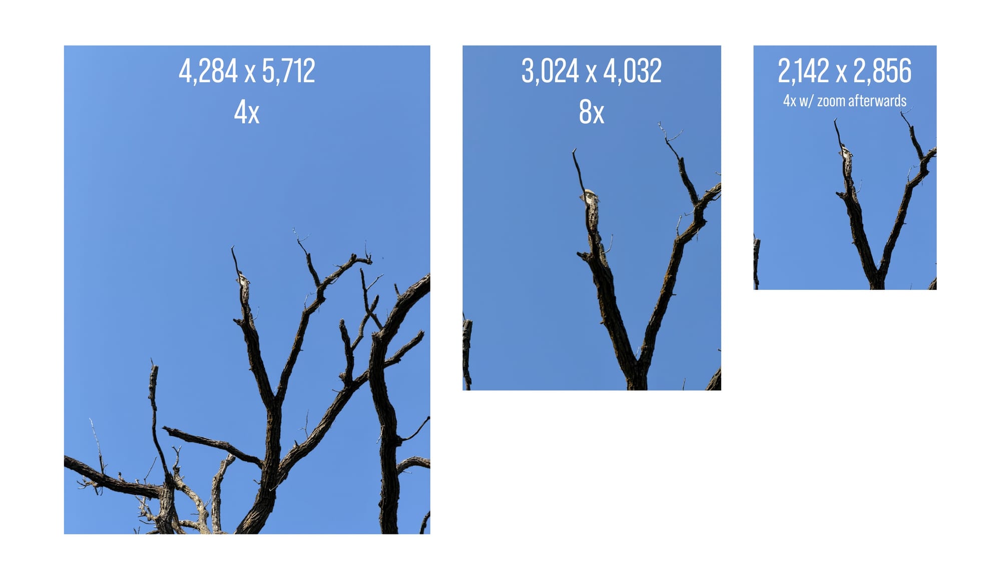 One of the things that struck me after finishing the review was how I've heard people in the past say that you may as well just use the 1x and 4x lenses at those resolutions and then crop in later if you want to zoom more. As I've thought more and more about this, the less sense that makes to me. And I think if you're doing that today, you're doing yourself a disservice. You're overthinking the solution and you should just do what the camera suggests.