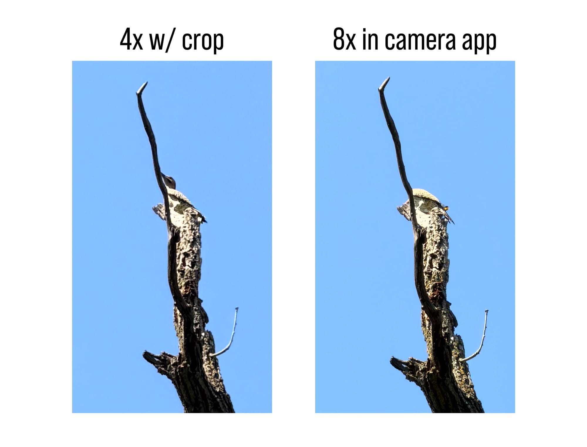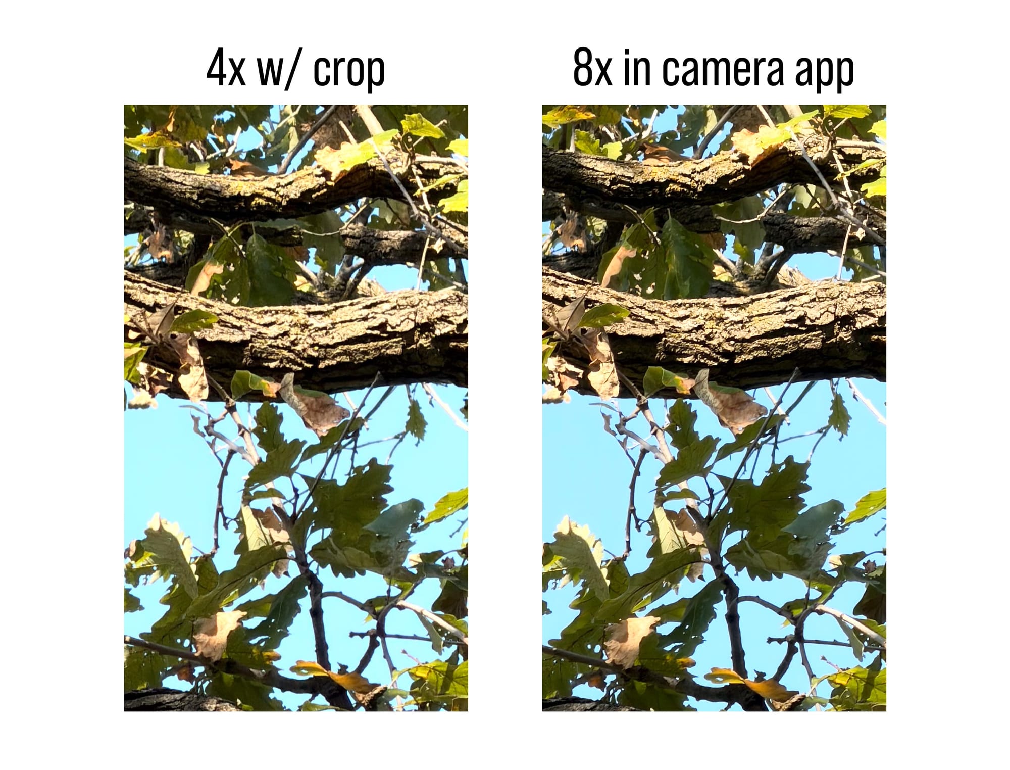 If you still want to crop later, that's fine, but it's plainly clear to me that if you need more zoom, you should do it in the Camera app because it will maximize the data you have to work with after the fact.