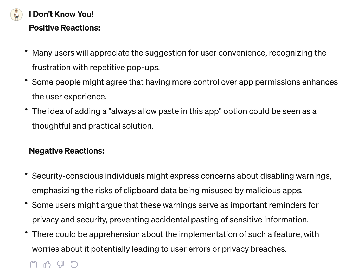 And as with basically all of these GPTs, this would be better if it was built into Mastodon/Threads/Ivory/etc. so that if I wanted, I could get this sort of alert in the posting interface, and not have to remember to go somewhere else. Again, GPTs feel like generating proof-of-concepts of features that will one day be built into “regular” software.